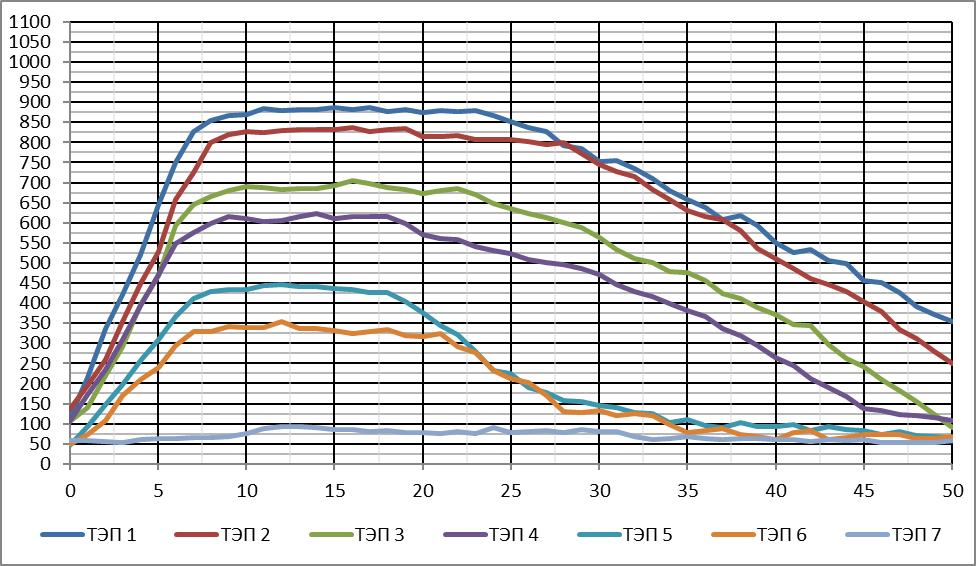 График №2 Изменение во времени испытания температур нагрева по высоте с внешней стороны образца фасадной системы, в точках 1-7 на расстоянии 150 мм от лицевой поверхности образца.